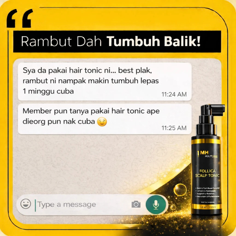 "Saya dah pakai hair tonic ni... Best pulak! Rambut ni nampak makin tumbuh lepas 1 minggu cuba."